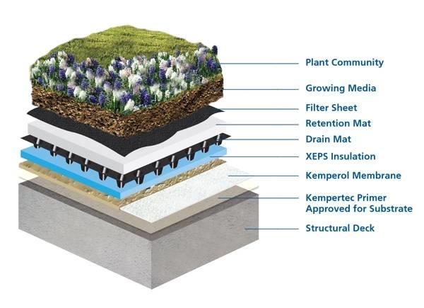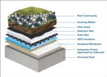 Kemper System offers a single-source warranty for green roof assemblies comprised of liquid-applied waterproofing membrane, insulation, drain mat, retention mat, filter sheet, growing media and in some instances, the plantings as well.